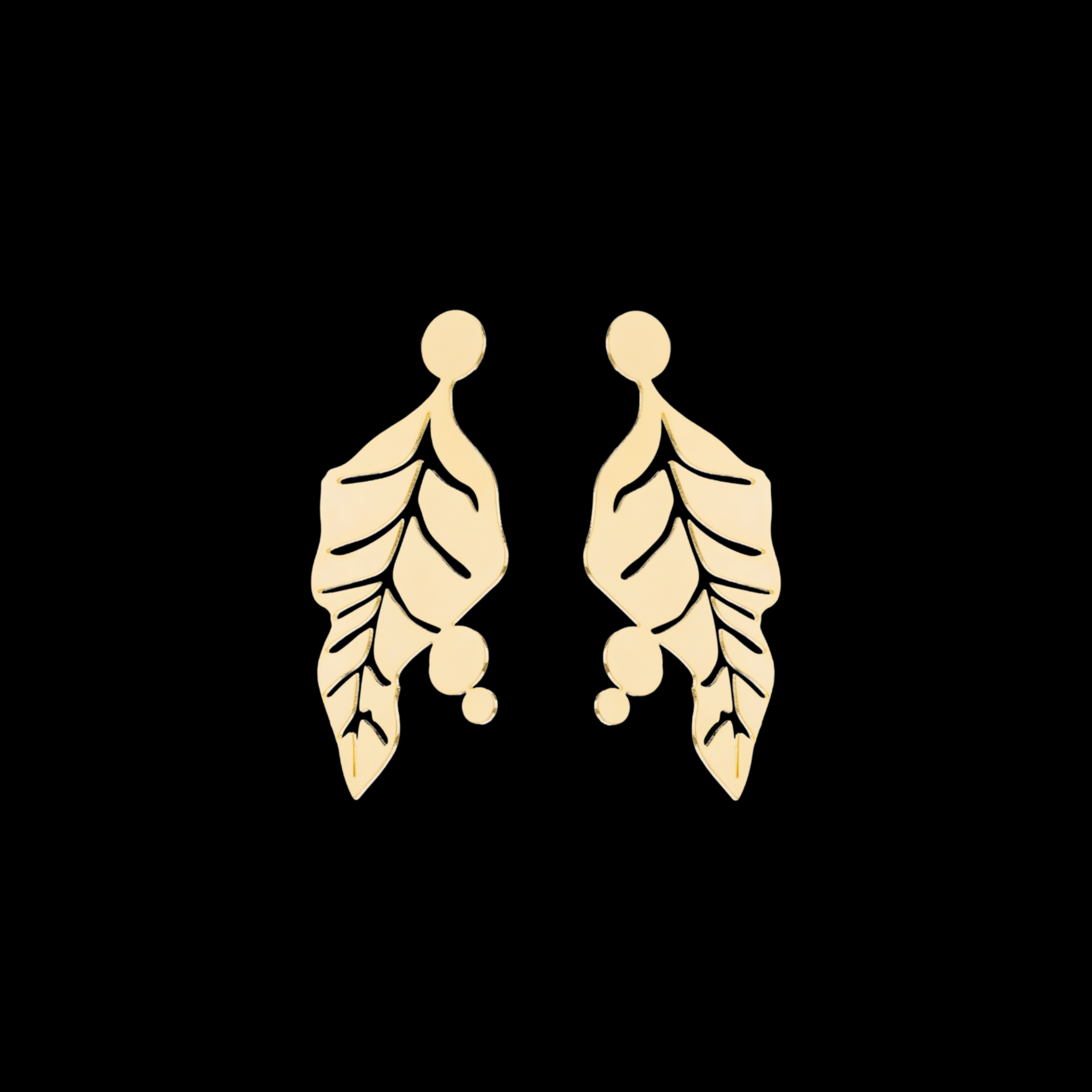 O Brinco Flolha 1 é produzido em Latão, banhado em ouro 18klts e apresenta semi brilho com poucas texturas escovada.