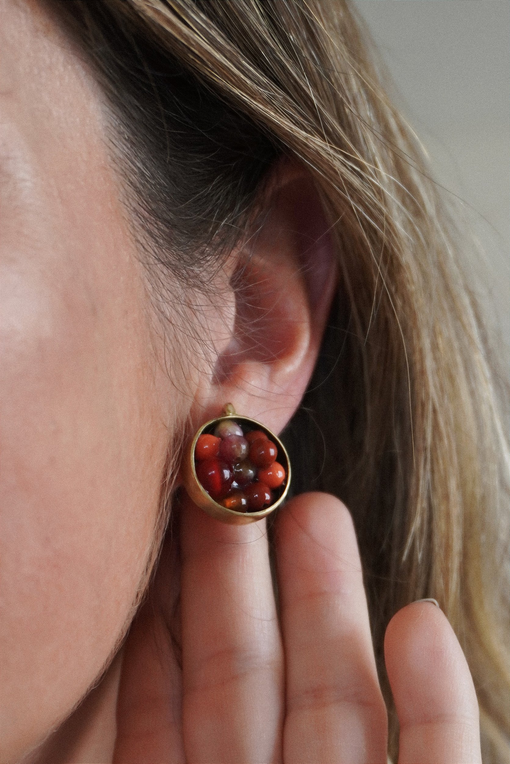 Cada elemento do brinco foi pensado para traduzir sensações: o vermelho profundo da Granada, com sua energia vital, o tom quente e terroso do Coral en contraste com os tons mais suaves da Jade,