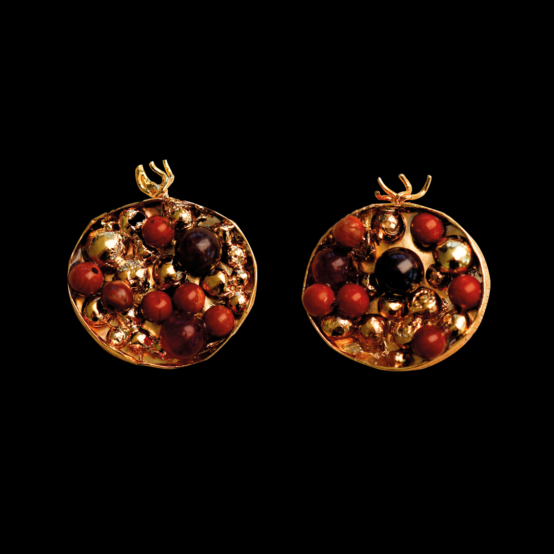 O brinco Granada da RoGarcia Joias Artesanais é uma joia viva. Esculpido à mão em latão com banho de ouro 18 quilates, ele carrega um trio de cores vibrantes e poderosas de miçangas de pedras naturais — Granada, Coral e Jade — em uma composição que é pura expressão, equilíbrio e conexão com a natureza.