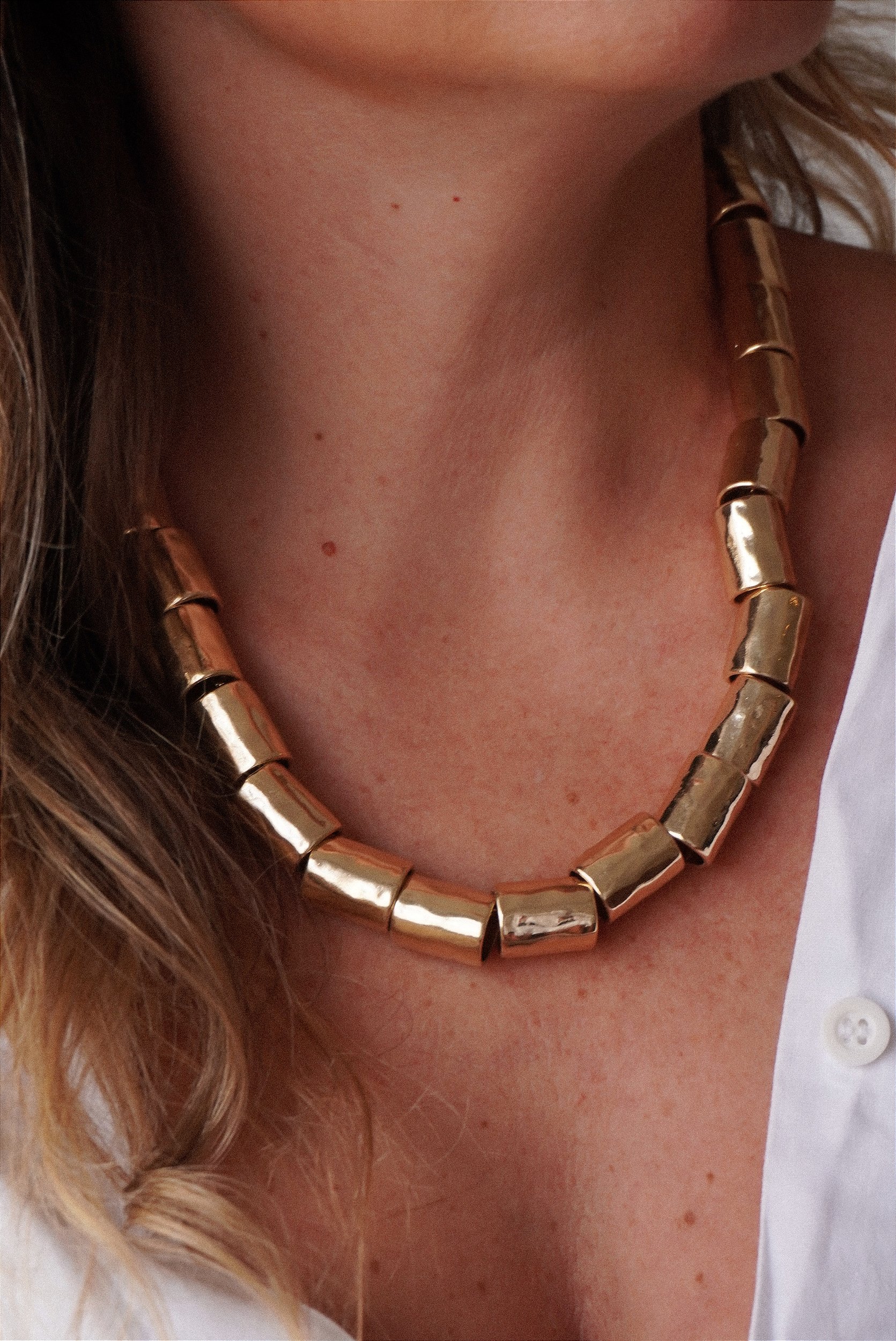 Colar Lorca, com estética contemporânea e linguagem escultórica, a peça transforma a geometria em movimento. Cada tubo representa um trecho do percurso, criando uma composição forte, elegante e cheia de significado.